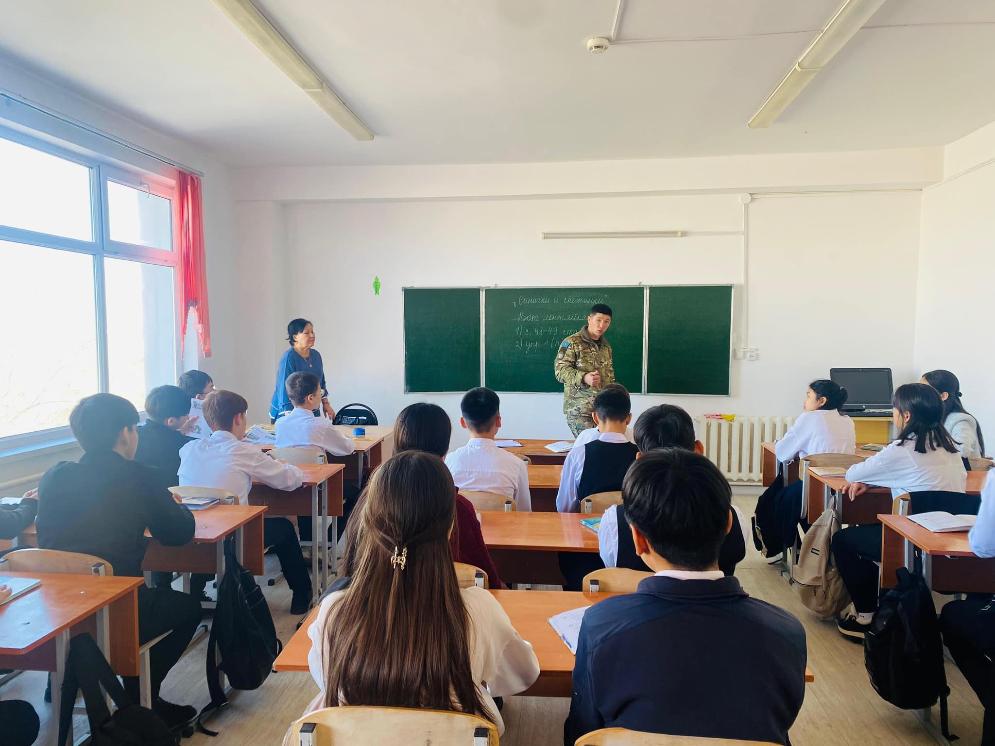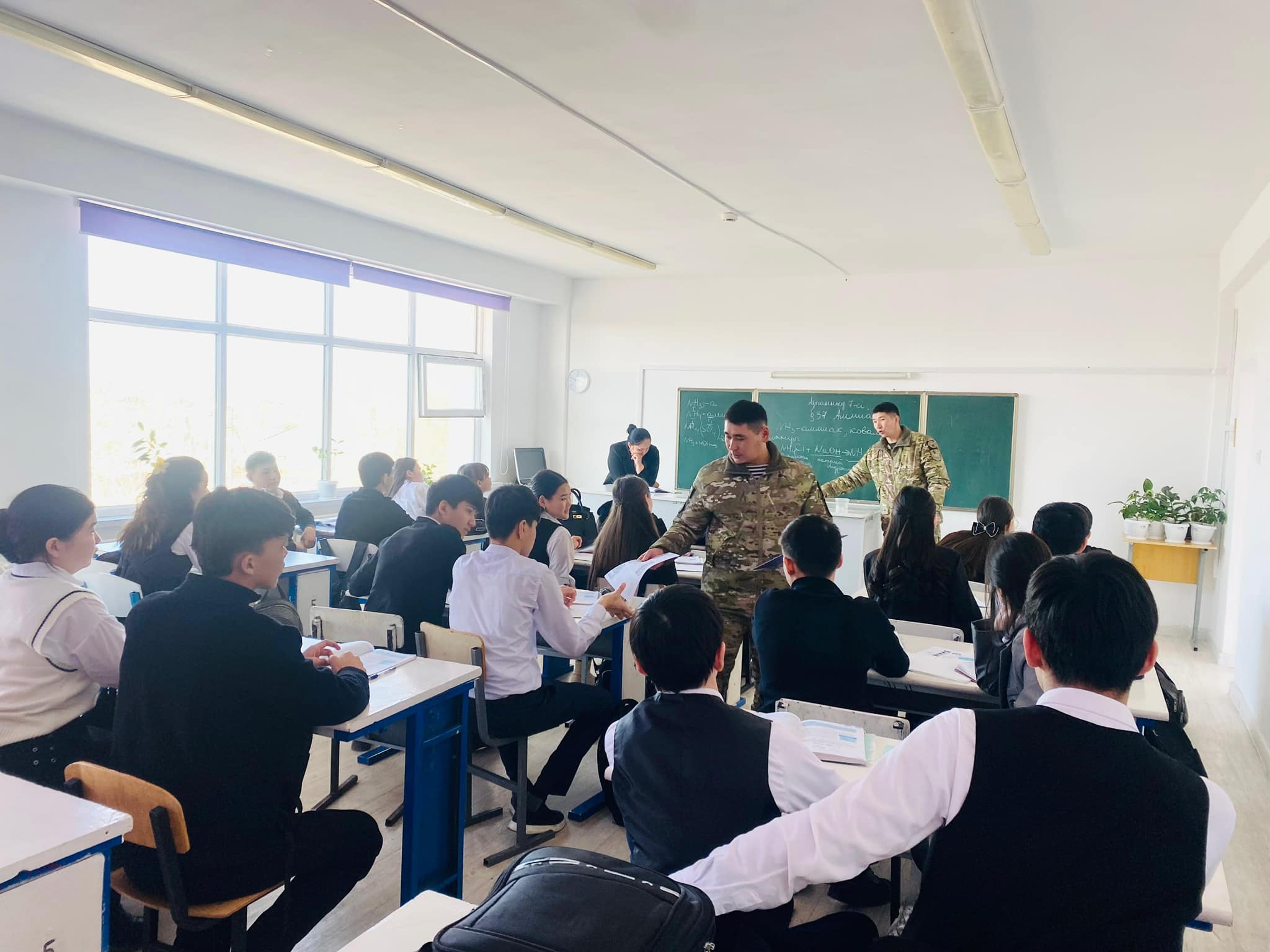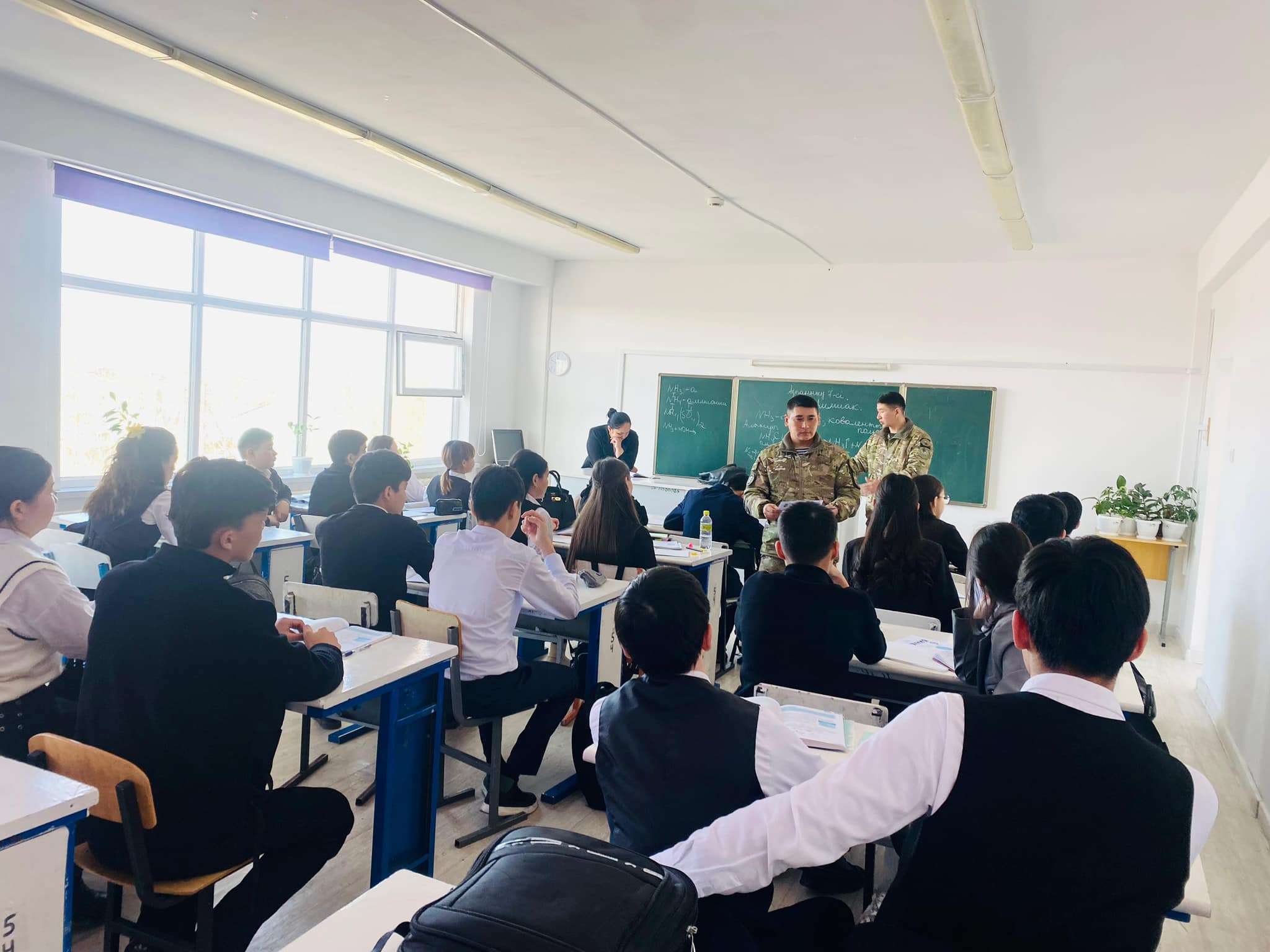 Қазақстан Республикасының Қорғаныс министрлігіне қарасты жоғары әскери оқу орындары мен Ш. Уалиханов атындағы ҚР ҚМ әскери колледжіне үгіт - насихат жұмысын жүргізу, әскери оқу орындарына түсу тәртібі мен шарттары жөнінде мағлұмат беру мақсатында мектебіміздің 9 және 11 сынып оқушыларына түсіндірме жұмыстары жүргізілді. Әскери қызметші мамандардың бүгіні мен келешегі, Отанымыз үшін маңызы зор екендігі түсіндіріліп, әскери адамның бір күндік өмірі, қандай мүмкіншіліктер қарастырылғандығы жөнінде көптеген ақпараттарды оқушыларға айта кетті.