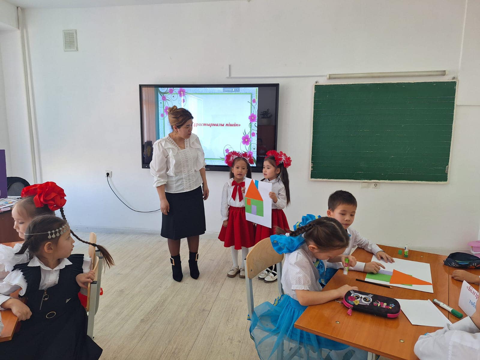 3 - кезең: "Құрастырмалы пішін" . Бұл кезеңде әр топқа конверт таратылды. Конвертте әр түрлі геометриялық пішіндер бар. Пішіндерді қолдана отырып, аппликация жасады .