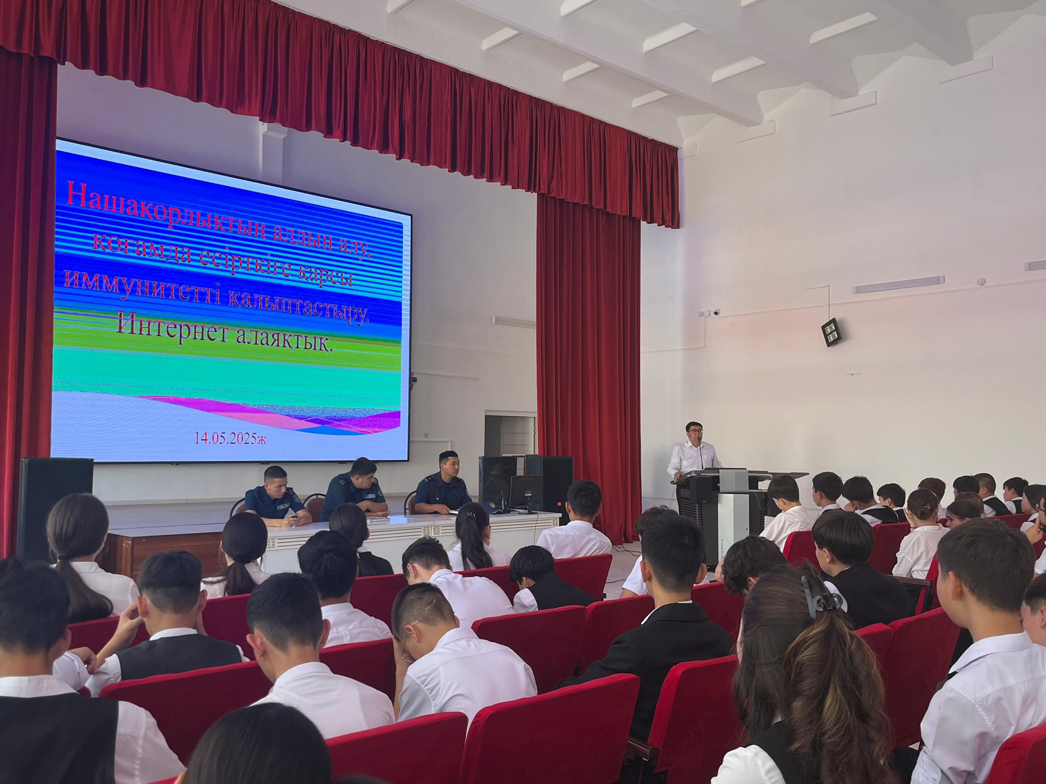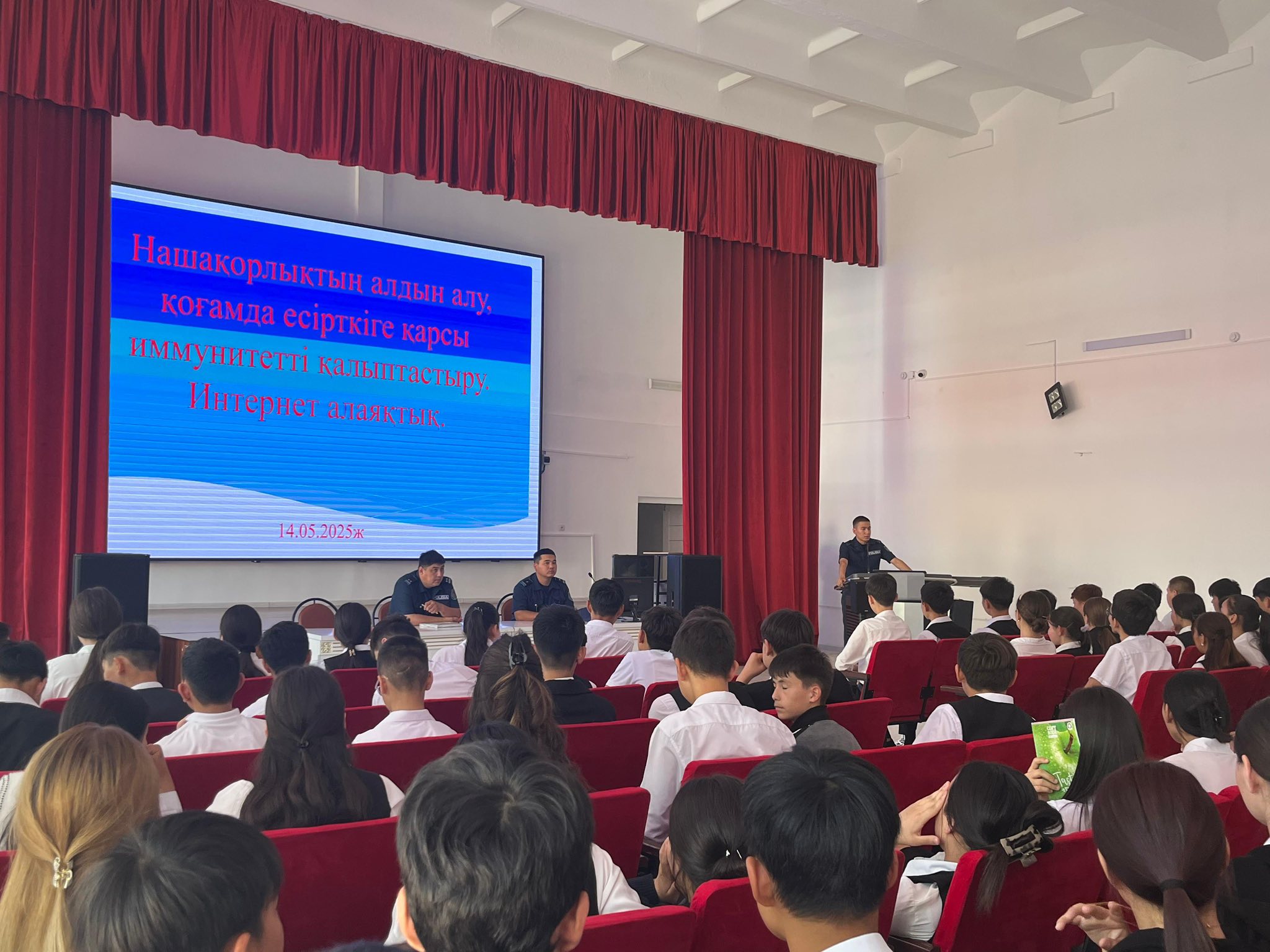 Ыбырай Алтынсарин атындағы №10 мектеп - лицейі оқушыларына нашақорлықтың алдын алу және қоғамда есірткіге қарсы иммунитетті қалыптастыру барысындағы профилактикалық шаралары мен интернет - алаяқтық қылмыстары туралы құқықбұзушылықтың алдын алу, топтық төбелестердің орын алмауына көмек көрсету түсіндірме жұмыстарын жүргізу мақсатында 8 - 11 сынып оқушыларына сала мамандарымен бірлесе отырып: